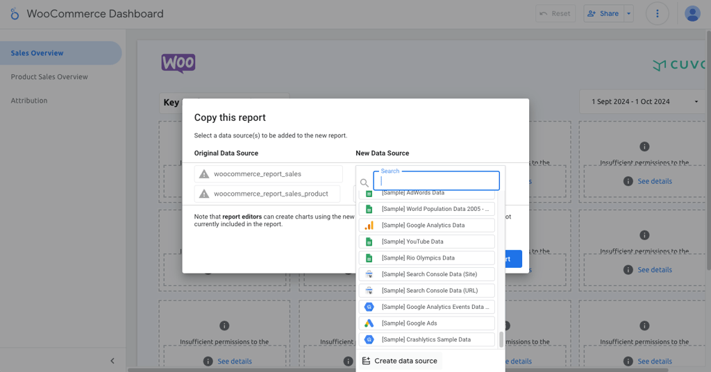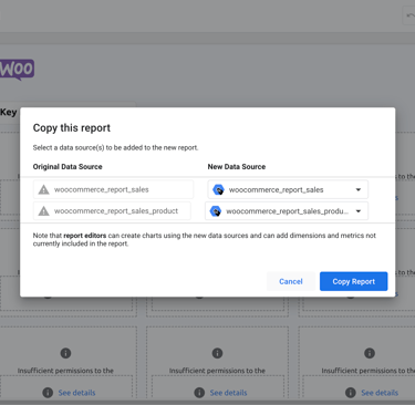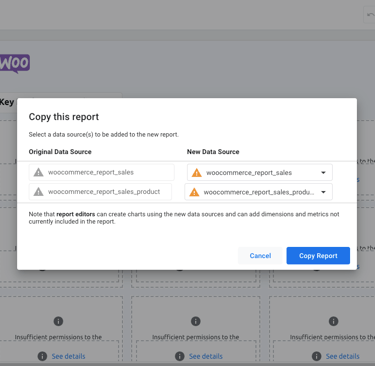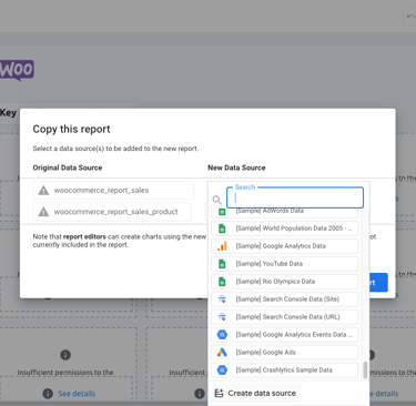 Al copiar el dashboard, se abrirá una ventana emergente para seleccionar la nueva fuente de datos que estará conectada a tus datos. Tu objetivo es encontrar en Looker, la tabla que tiene el mismo nombre que la fuente de datos original. Hagamos un ejemplo para la tabla "woocommerce_report_sales":