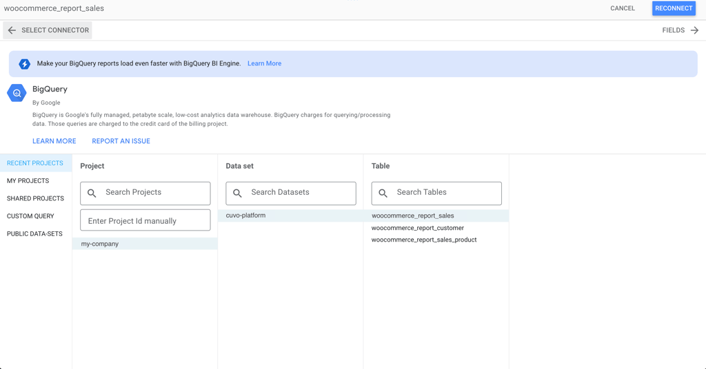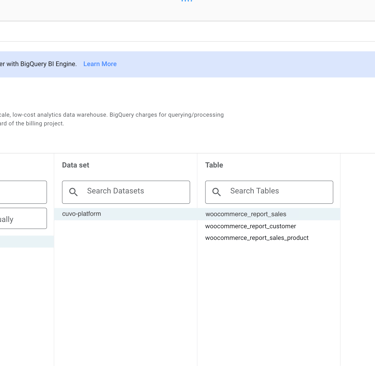 Busca el proyecto de tu empresa, el dataset "cuvo_platform" y elige la tabla de datos correspondiente, en nuestro caso woocommerce_report_sales.