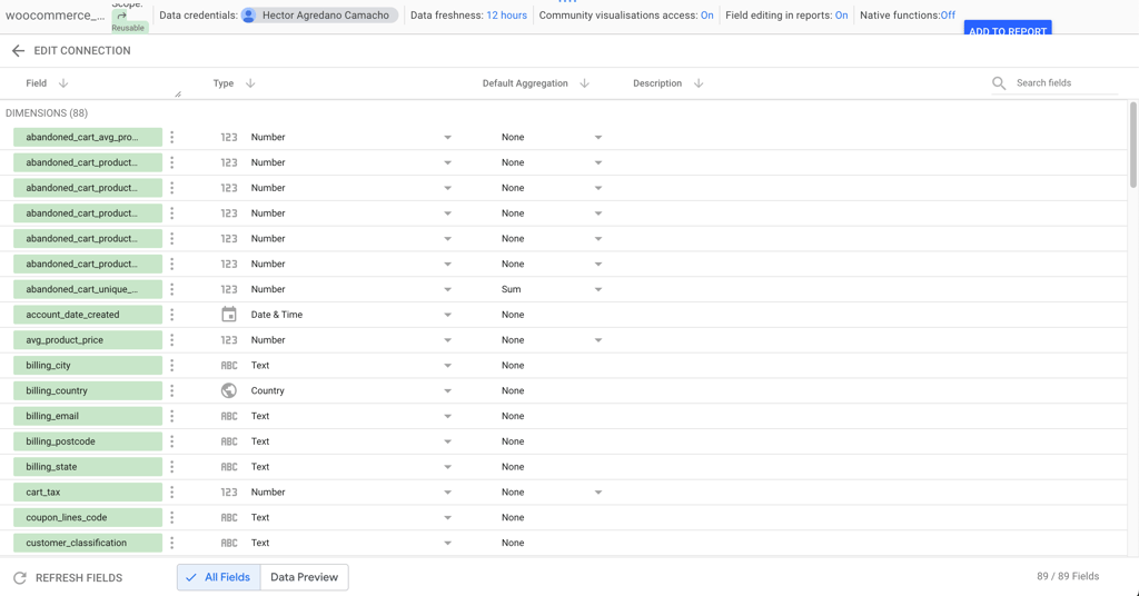 La nueva pantalla te mostrará todos los campos incluidos en la tabla, realiza los ajustes que necesites y haz click en el botón azul "Add to report".